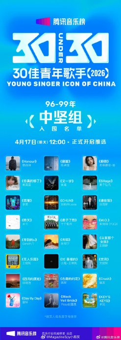 2026年4月16日,腾讯音乐榜正式揭晓“30佳青年歌手”中坚组入围名单。该组别聚焦1996-2000年出生的青年音乐人,综合全年作品在腾讯音乐由你榜、浪潮榜的数据表现及行业影响力进行遴选。此次入围的12位歌手涵盖多元音乐风格与领域,包括: